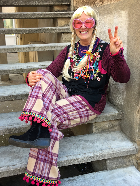 I had some ideas for ways to improve my costume, and I enlisted the help of cousin Sharon, who was on her way over for a visit. Her daughter Anne really came through with a couple of great additions: a blonde wig and giant pink sunglasses. Sharon was with me when I found some fabulous trim to add to the hem of each pant leg. I’d hoped to find some of the big, fat, fuzzy yarn we tied our hair with back in the real 1970s, but had no luck with that.
