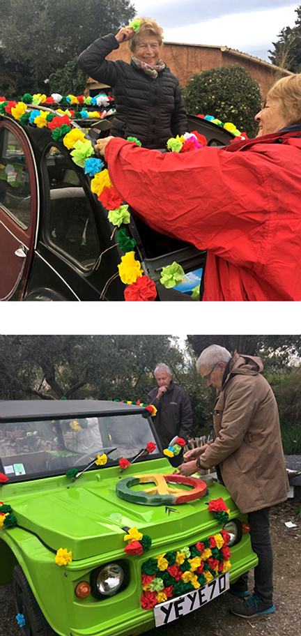 Several large bags of crêpe paper flowers appeared, and we all tucked in to apply the flowers to various parts of the two cars. One of the cars is a 2CV I’ve seen around town, and it turns out to be owned by an acquaintance, Paul, who gave me a ride in it when he needed to run home for ribbon.