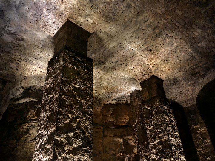 The piece of the story that is not a legend is how these caves were formed. The village of Roquefort is perched on the north slope of a steep, rocky formation. This limestone plateau is curved, making a sort of steep bowl. A very long time ago, earthquakes in the region led to a lot of movement; in what is now Roquefort, part of Mount Combalou collapsed, forming a talus slope of giant boulders. Over the millennia, earth gradually covered the rocks, and then trees and plants began to grow there, becoming the dense forest we see today. But beneath the surface, there were still great open areas that were never filled in by earth, and those are the extensive caves of Roquefort.