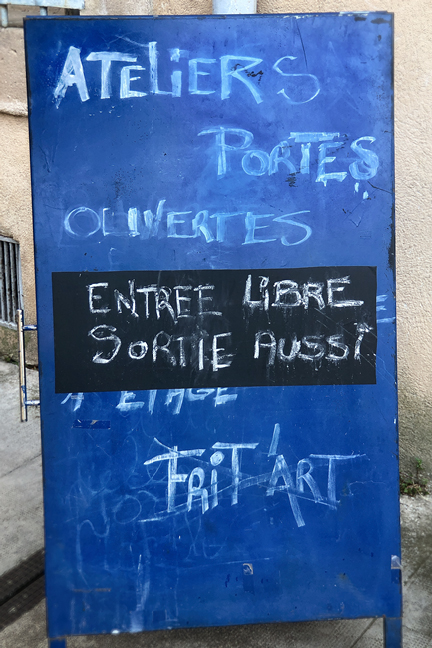We were walking through Lodève toward the Monument aux Morts, when we happened upon this sign for open art studios. One gregarious artist was outside, and he encouraged us to step inside, where we browsed through several studios and found no treasures to take home. But the sign is funny.