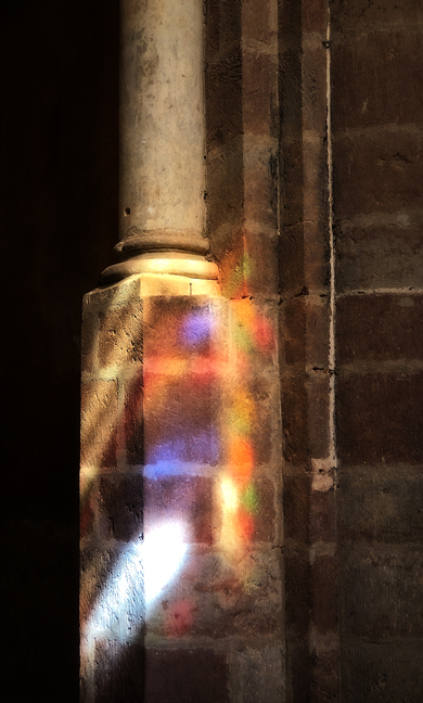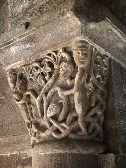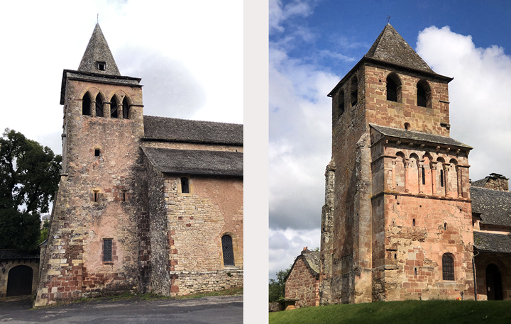 We ate lunch on the very edge of the cliffs, then drove on to the hamlet of Bessuéjouls to visit another 12th century church built of the gorgeous red sandstone of the region. This church is l’Église Saint-Pierre in the hamlet of Bessuéjouls, and it’s a popular stop with people who are walking the Chemin de Compostelle. Interesting to all three of us was the magnificent giant sequoia tree that stands next to the church and completely dwarfs it.