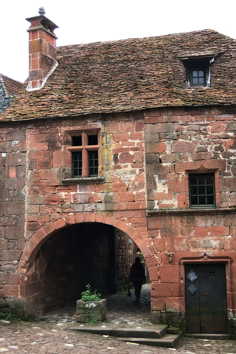 We got our raincoats and umbrellas, and drove into Égletons to see if the visitors center had any suggestions for rainy-day things to do in the area. Not much, it turns out, so three somewhat soggier souls piled back into the car for the one-hour drive toward Collonges-la-Rouge. We drove through low, thick fog and occasional rain, but by the time we arrived, the grey was lighter and the rain had stopped.