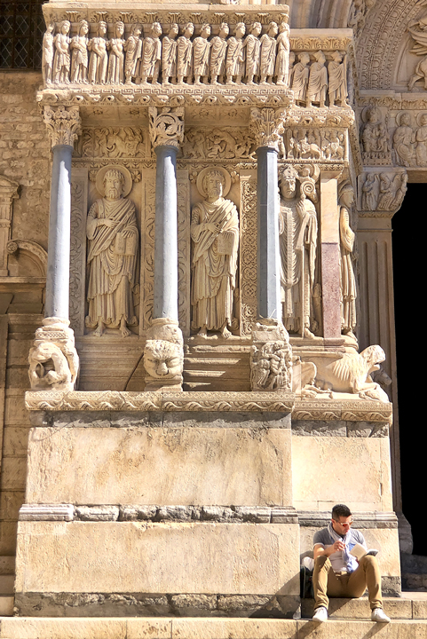 A reader enjoys the sun in the exquisite west portal of the 12th-century Cathédrale Saint-Trophime. The sculptures here and in the cloister are particularly fine.