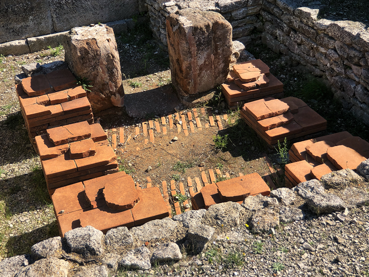 There is a possibility that Glanum was occupied as early as 1,000 BC, but its established history begins with the Celto-Ligurian tribe known as the Salyens. At the site of a spring reputed to have healing powers, they founded a town at the foot of the rugged Alpilles. The town was wealthy, and allied early with Massalia (Marseille), which had been founded by the Greeks in 600 BC. After a conflict, the Greeks turned to their allies the Romans, who drove out the Salyens, stayed in the town, and continued to build and grow the settlement. Later, the town was sacked and then abandoned, and it was eventually buried under mud. We have that mud to thank, because full excavations did not begin until 1921; much was discovered, and the excavations are ongoing. Above, loose bricks and a brick floor from the earliest section of the town.
