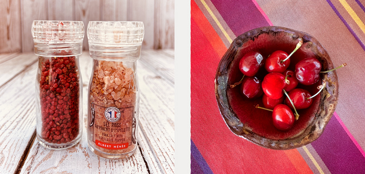 Left, pink peppercorns and pink salt. Right, a small bowl of cherries on the dining table.