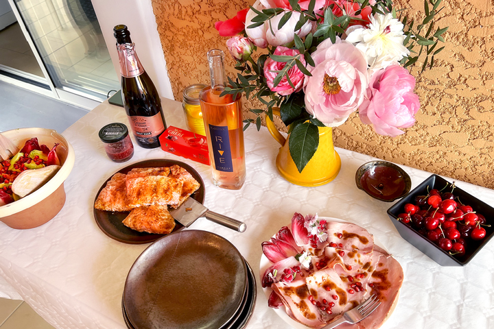 We served the Rive rosé with the main course (plat in French), which consisted of two protein dishes, salmon and ham. We kept them both fairly simple, making a sauce that worked for both. We also had a salad made of purple endive and red oak leaf lettuce, with grapefruit, avocado and pomegranate seeds. The salad dressing was made with a raspberry coulis. At the grocery store, we happened to find some edible flowers in a medley of pink hues, and those went into the salad and also decorated the serving dish for the ham.