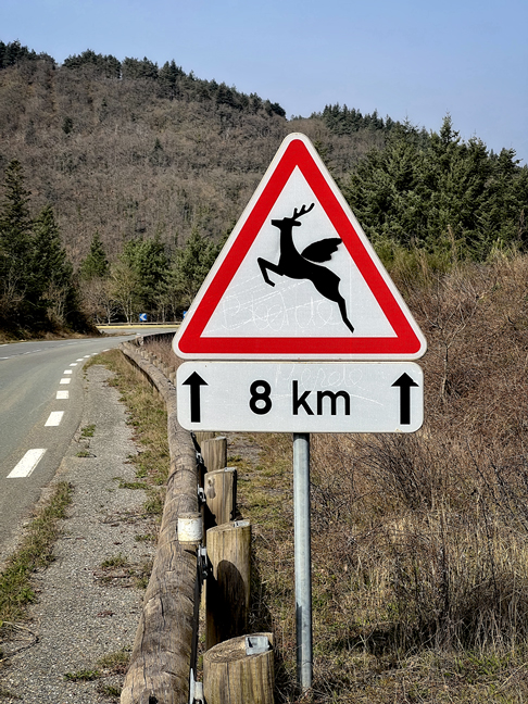 I was driving along a country road and spotted the sign below, an amusing bit of street art that’s similar to the work of an artist I’ve met, Clet Abraham. Clet has altered many street signs in his home city of Florence, Italy, and more of his work is found around the world. I have no idea who helped this deer to fly, but it’s fun!