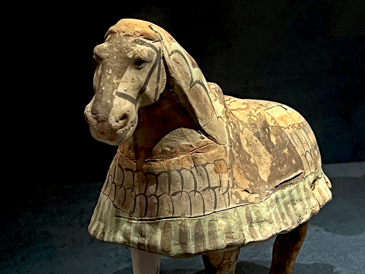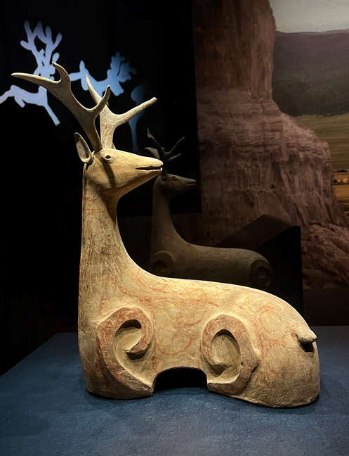 The first section of the show is devoted to thoroughly setting the stage, starting with a description of the paleontology and geography of the region, to enable visitors to have a sense of the land, its weather, its animals, and its early nomadic people. There is a woolly mammoth tusk from 2.6 million years ago, and a great many small works of art from the Neolithic and Bronze Ages.