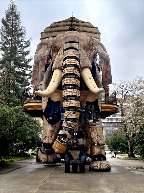 After a nice lunch in the historic Bouffay quartier, we walked toward the old Nantes shipyards, home to Les Machines de l’Île, an animated steampunk dreamland. I had heard about these wondrous mechanical creatures, and hoped for a ride atop the massive elephant.