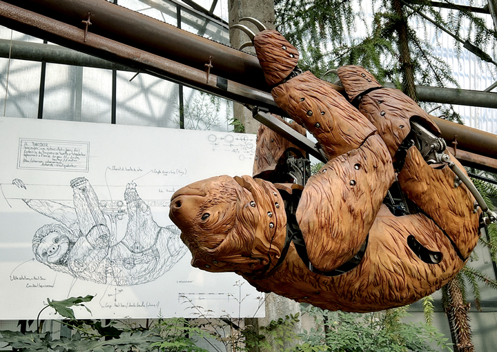Some of the animals inside the hall are destined to live in the massive Heron Tree, projected to be completed in 2027. These include the giant sloth below, a hummingbird that pokes its beak into a flower to gather nectar, and a chameleon that darts its tongue out to catch a fly. We also got to fly up to the ceiling, soaring above the crowd, riding in baskets below the wings of a heron.