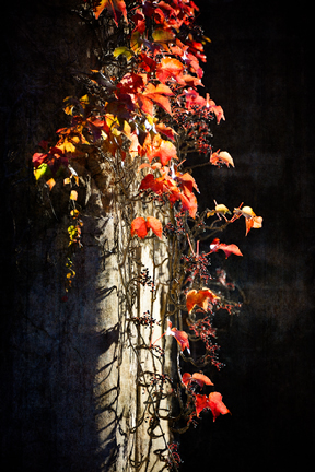 Previous Image Next Image 46 The last of the day’s sun is caught in vivid red leaves curling on a stone building.