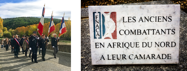 The South of France saw enormous loss during World War I, the war to end all wars and the war that brought us Armistice Day. About 12 times as many men from this town died during WWI as during WWII. I missed the start of today’s event at the cemetery, but caught up when the French Tricolore was marched through town, proudly borne by several veterans. A whole parade of townspeople accompanied them to the war memorial, where young children were invited to the front of the crowd to read the names of the fallen, and the local chorus gave a rousing rendition of the French national anthem, the Marseillaise. The mayor gave a speech, as did one or two other dignitaries. I didn’t follow all the French, but I understood enough to know that both of the longer speeches gave enormous credit to the United States for entering the war and helping the Allies win.