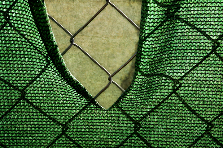 A tear in the net hanging over a chain link fence