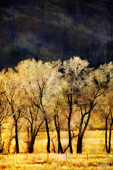 What I can tell you is that I made it in late afternoon on a November day near our house in Steamboat. The sunlight caught the bare tree branches and highlighted them against the darker hills in the background. The blues you’re seeing are the tree-covered hills, which really were a dark steel-blue. And then I added some texture, as I do to many of my photos.